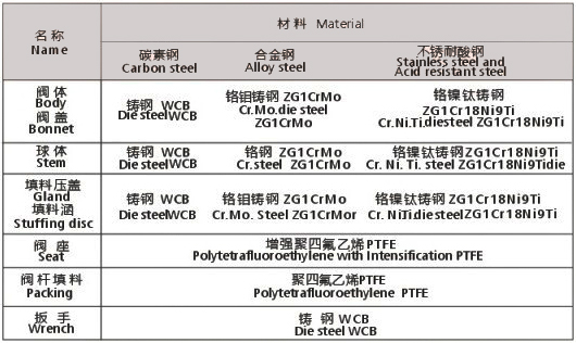 Q44(5)F46衬氟三通球阀采用了氟塑料作为球阀的内衬,并配之以新型的带杆球体结构,再加上其独特的弹性唇式密封座结构,使其具有普通球阀的各项优点,能在大压差和较大的温差变化范围内具有高密封性能和低操作扭矩。本产品适用于各种工业管道中液体和气体的输送(包括蒸气),在各种酸、碱、盐类等强腐蚀性介质中均能很好地工作。 Q44(5)F46衬氟三通球阀主要零件材料