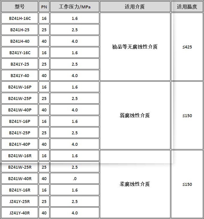 BZ41H、BZ41W、BZ41Y 型保温闸阀:手动、法兰连接、明杆楔式刚性单闸板,阀座密封面材料为合金和不锈钢,公称压力 PN16~PN40,阀体材料为碳钢(BZ41H-16C~BZ41H-40 BZ41Y-16C~BZ41Y-40)、铬镍钛不锈钢(BZ41W-16P~BZ41W-40P BZ41Y-16P~BZ41Y-40P)、铬镍钼钛不锈钢(BZ41W-16R~BZ41W-40R BZ41Y-16R~BZ41Y-40R),具有保温功能的闸阀。主要用于石油、化工、冶金、制药等各类系统中,能保温和防止介质结晶,以输送常温下会凝固的高粘度介质。