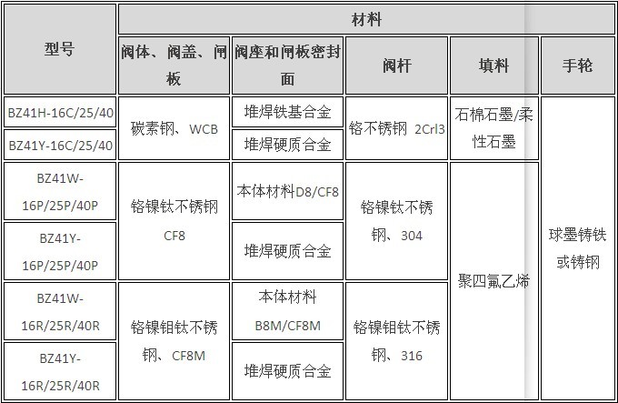 BZ41H、BZ41W、BZ41Y 型保温闸阀主要零件材料
